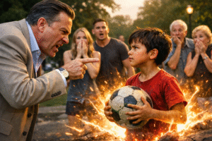 «¡Oye niño, deja ese balón! ¡Este parque no es para chicos como tú!» —escupió el hombre adinerado, mirando con desprecio al pequeño—. Pero lo que ocurrió después dejó a todos en el parque completamente en shock… 😱😱😱