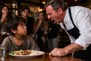 «¡Deja esa comida ahora mismo! ¡No tienes dinero para pagarla!» —gritó el dueño del restaurante, golpeando la mesa frente al niño—. Pero la respuesta que él dio dejó a todos completamente atónitos… 😱😱😱