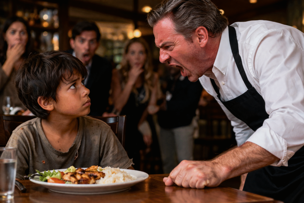 Tomás sostuvo la mirada del dueño sin temblar, algo que nadie esperaba de un niño en esa situación. No había rabia en sus ojos, sino una calma extraña, casi incómoda, como si supiera algo que los demás no.