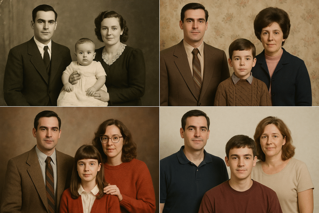 Esa noche, Sofía no pudo dormir. Las fotos seguían sobre la mesa, alineadas como piezas de un rompecabezas prohibido. En cada imagen, el hombre estaba un poco más cerca de la cámara. Como si avanzara década tras década, paso a paso, directo hacia el presente. Directo hacia ella.