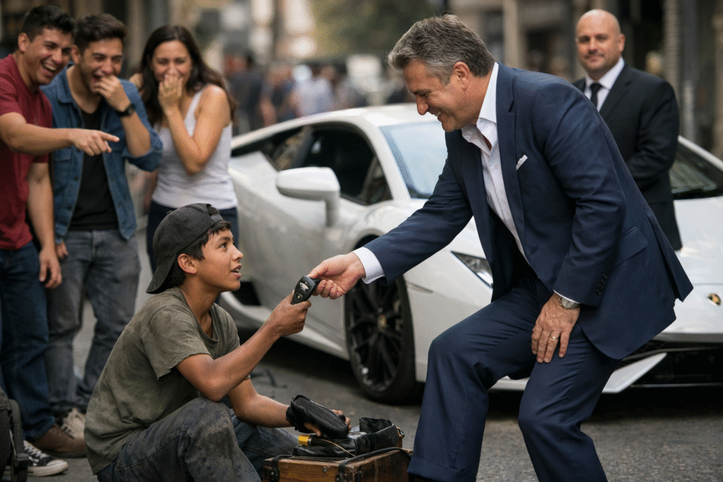 Sin añadir otra palabra, el empresario giró sobre sus talones y se alejó entre la multitud. Algunos pensaron que la escena había terminado. Tommy también quiso creerlo. Guardó las monedas exactas en una lata oxidada, limpió la caja de madera y siguió trabajando con el siguiente cliente. Pero una incomodidad rara quedó suspendida en el aire, como antes de una tormenta.